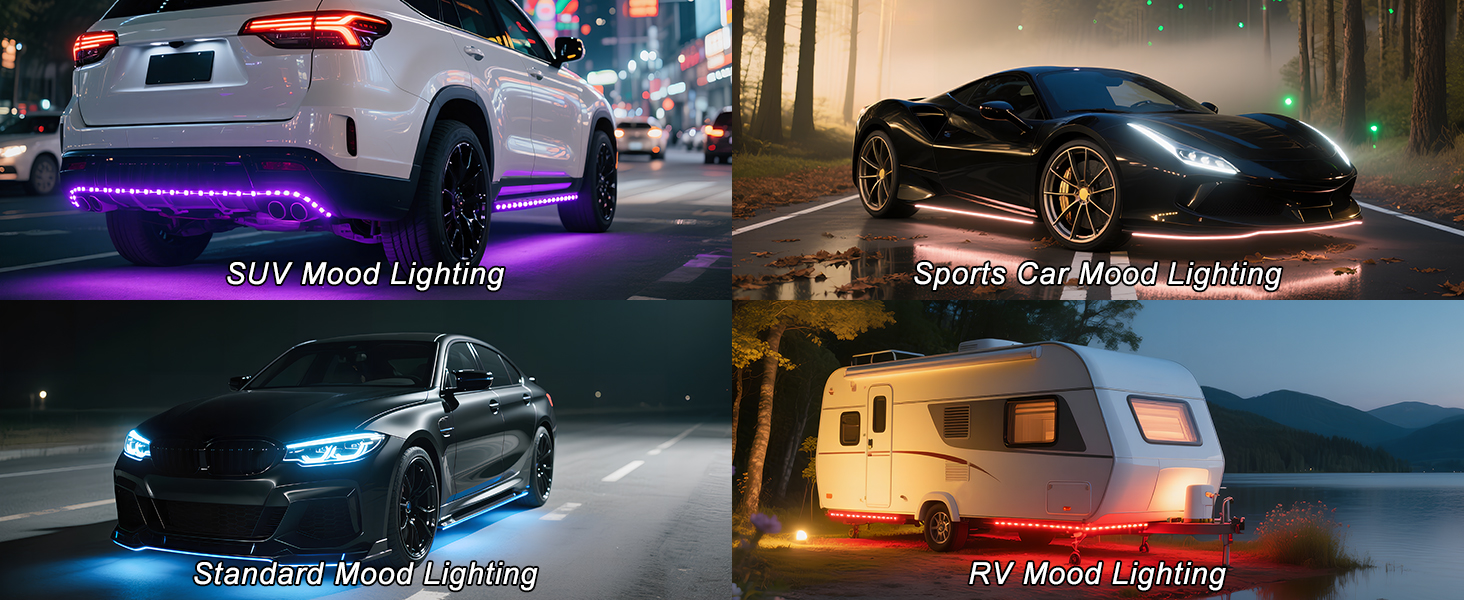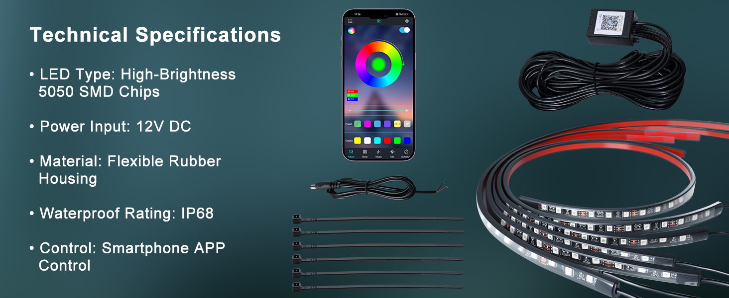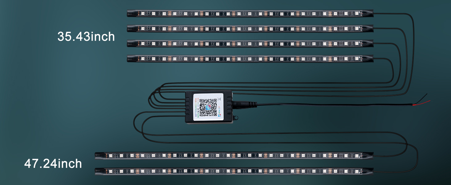 • Smart Multi-Function Lighting Modes:”Choose from 8 static colors, 4 dynamic patterns, and sound-activated strobe effects.Unique sequential fade & jump modes enhance night drives or car shows. Works with all 12V vehicles.”