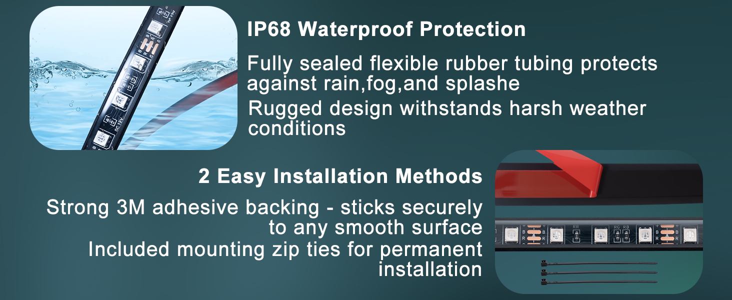 • Military-Grade Waterproof & Durability:”IP68 waterproof PVC strips withstand rain, mud, and car washes. Reinforced 3M adhesive + zip ties ensure stability at highway speeds.No rust, no cracks—just all-weather performance.”