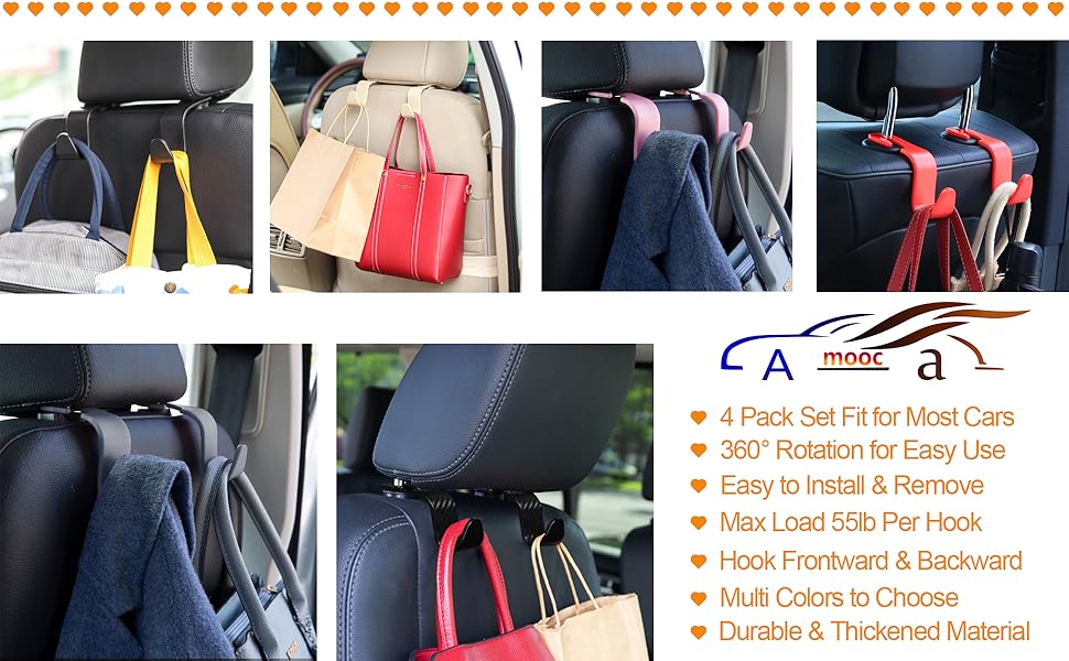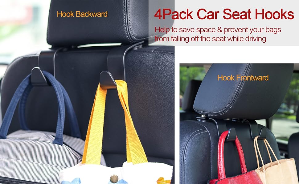 This item can be used for the front or back of the seat the hook will easily hold up to 55 lb(25KG)/ per hook